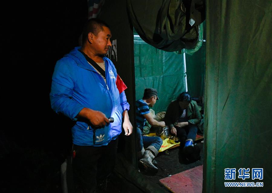 西藏林芝市墨脱镇玛迪村村主任次仁旺加(左)在排查临时救灾安置点内的安全隐患(10月20日摄)。玛迪村临时救灾安置点设置在远离江边的山坡上,共有12顶帐篷,约150人在此居住。 新华社记者 刘东君 摄