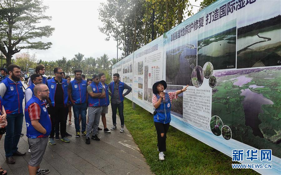 10月21日,参加湿地保护志愿服务讲解员培训的留学生志愿者在美舍河凤翔湿地公园听中国志愿者的讲解。 新华社记者杨冠宇摄