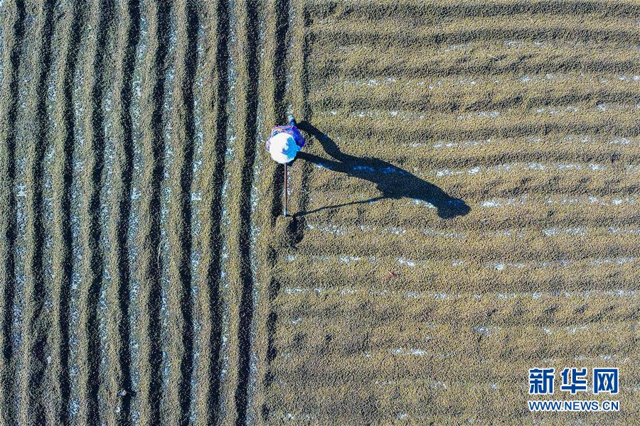 10月21日,江苏省淮安市盱眙县穆店镇农民在翻晒收获的芡实(无人机拍摄)。 新华社发(周海军 摄)