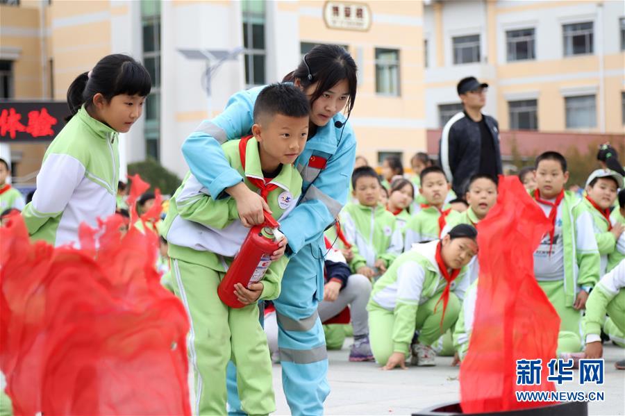 10月22日,在山东省青岛西海岸新区第二实验小学,学生学习消防灭火技能。 为增强中小学生的安全应急意识,普及安全知识和安全技能,山东青岛西海岸新区教体局结合各校实际情况,采取集中体验培训和进馆体验的方式,为中小学学生进行应急安全培训。学生们在专业安全教辅机构的指导下,在体验中提高自救互助能力。 新华社发(王培珂 摄)