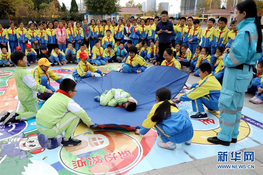 10月22日,在山东省青岛西海岸新区第二实验小学,学生体验地震逃生。 为增强中小学生的安全应急意识,普及安全知识和安全技能,山东青岛西海岸新区教体局结合各校实际情况,采取集中体验培训和进馆体验的方式,为中小学学生进行应急安全培训。学生们在专业安全教辅机构的指导下,在体验中提高自救互助能力。 新华社发(王培珂 摄)