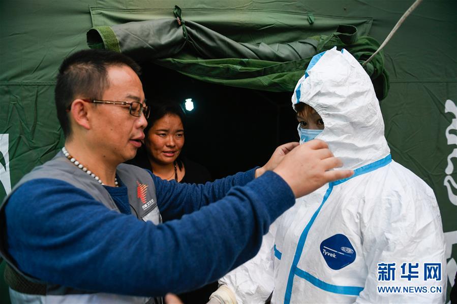 10月22日,西藏林芝市疾控中心副主任医师张睿(左)在墨脱县墨脱镇玛迪村临时救灾安置点指导村医次仁央前穿戴环境卫生消杀防护服。 当日,由西藏林芝市卫计委牵头发起,由林芝市人民医院、林芝市疾控中心医卫工作者组成的医疗卫生保障组赶赴墨脱县临时救灾安置点开展健康巡诊、传染病监测预警、环境卫生消杀等活动。 17日,雅鲁藏布江西藏米林县派镇加拉村附近突发山体滑坡,堵塞河道,形成堰塞湖。地处雅鲁藏布江堰塞体下游的墨脱县立即开展群众转移工作。目前,安置点社会生活井然有序。 新华社记者 刘东君 摄