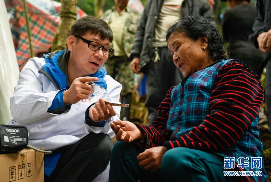 10月22日,广东中山大学附属第一医院援藏林芝市人民医院的副主任医师李振宇(左)在墨脱县墨脱镇玛迪村临时救灾安置点为群众进行健康巡诊。 当日,由西藏林芝市卫计委牵头发起,由林芝市人民医院、林芝市疾控中心医卫工作者组成的医疗卫生保障组赶赴墨脱县临时救灾安置点开展健康巡诊、传染病监测预警、环境卫生消杀等活动。 17日,雅鲁藏布江西藏米林县派镇加拉村附近突发山体滑坡,堵塞河道,形成堰塞湖。地处雅鲁藏布江堰塞体下游的墨脱县立即开展群众转移工作。目前,安置点社会生活井然有序。 新华社记者 刘东君 摄