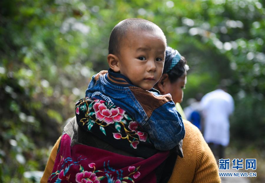 10月22日,在西藏林芝市墨脱县墨脱镇米日村临时救灾安置点,一位母亲背着孩子走在路上。 受雅鲁藏布江堰塞湖影响的群众被转移到临时救灾安置点,这里秩序井然,群众基本生活得到保障。10月17日,雅鲁藏布江米林县加拉村附近发生山体滑坡,堵塞河道,形成堰塞湖。 新华社记者 刘东君 摄