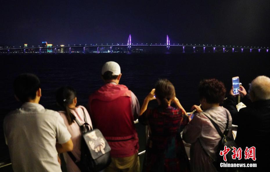 10月22日晚,游客在珠海乘坐游船近距离观赏即将通车的港珠澳大桥。港珠澳大桥即将于24日上午通车。 中新社记者 张炜 摄