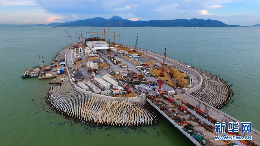 2017年7月4日拍摄的建设中的西人工岛。7月7日,港珠澳大桥海底隧道正式贯通,港珠澳大桥实现了主体工程全线贯通(无人机拍摄)。 港珠澳大桥通车在即。从2009年12月15日,港珠澳大桥正式开工建设,到2018年2月,港珠澳大桥主体工程通过交工验收,具备通车试运营条件,9年间,潮起潮落、寒来暑往,数以万计的建设者在伶仃洋上造桥,在大海深处“穿针”,构筑起全长55公里的世界级跨海通道。 新华社记者 梁旭 摄