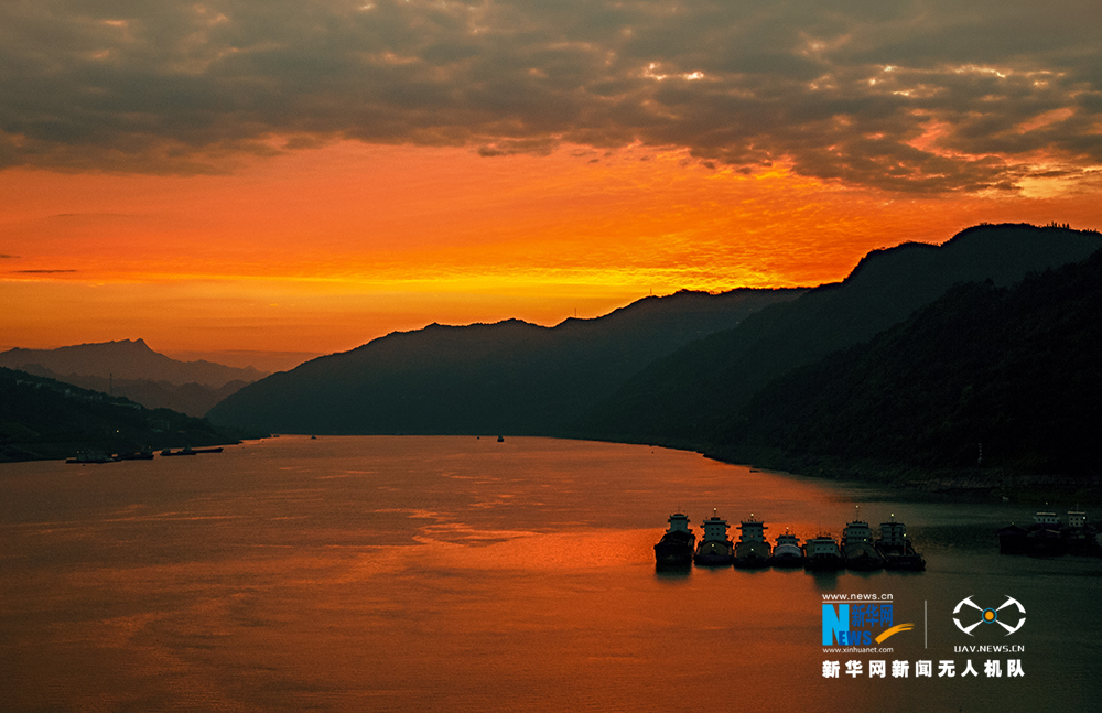 秋冬季节,位于三峡库区的重庆市云阳县展现出别样景致。长江水绕城而过,县城傍山而立,在朝霞、夕阳、夜色中都似一幅画。图为无人机航拍云阳朝霞光景。新华网发(王强 摄)