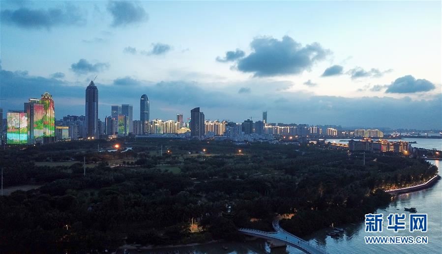 这是黄昏下的海口市万绿园(10月22日无人机拍摄)。 新华社记者 杨冠宇 摄