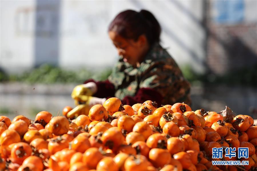 当下正值柿子收获季节,在河北省石家庄市井陉县柿庄村,农民忙着进行柿子深加工处理。柿子经过去皮、上架、自然风晒、压捏定型、潮霜等多道工序后,便可上市销售。到目前为止,柿庄村今年柿子深加工成品3万吨,产值12万元,带动周边群众增收致富。