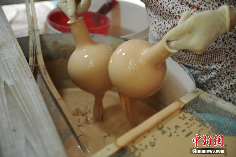 工作人员正在对酒瓶进行上浆。中新社记者 刘冉阳 摄