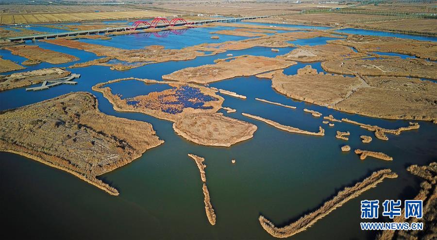 宁夏银川市阅海湿地秋景(10月22日无人机拍摄)。