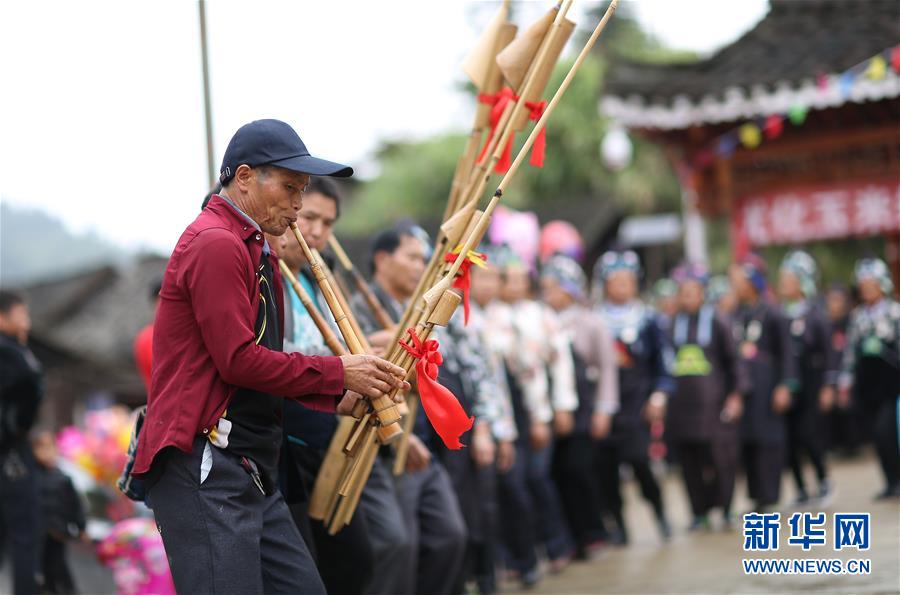 10月25日,在贵州省黔东南苗族侗族自治州丹寨县扬武镇排莫村,村民在吹奏芦笙。 当日,贵州省黔东南苗族侗族自治州丹寨县扬武镇排莫村迎来了苗族传统节日“吃新节”,来自周边村寨的近千名苗族同胞以跳芦笙舞、蜡染技艺比赛的形式欢庆节日,庆祝丰收。 新华社发(黄晓海 摄)
