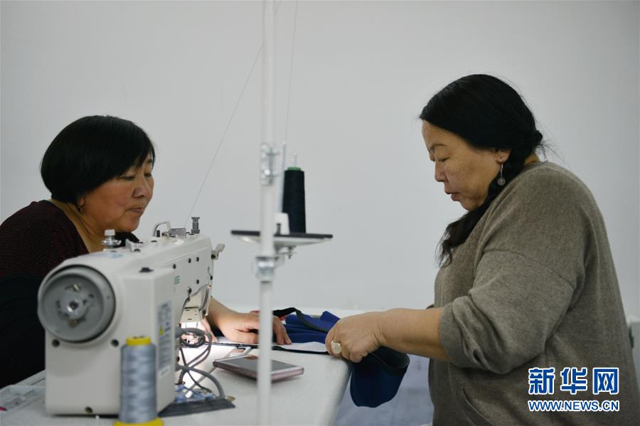 10月24日,在鄂温克旗精准脱贫民族服饰技能培训班上,哈斯格日乐(右)在指导学员。新华社记者邹予摄