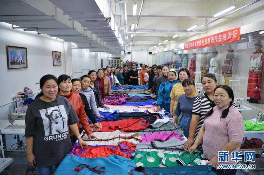 10月25日,在鄂温克旗精准脱贫民族服饰技能培训班上,哈斯格日乐(右一)和学员们合影。 新华社记者邹予摄