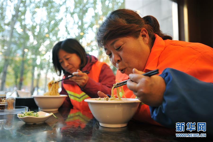 10月26日,河北省张家口市宣化区环卫工人在一家酒店的“爱心驿站”用早餐。