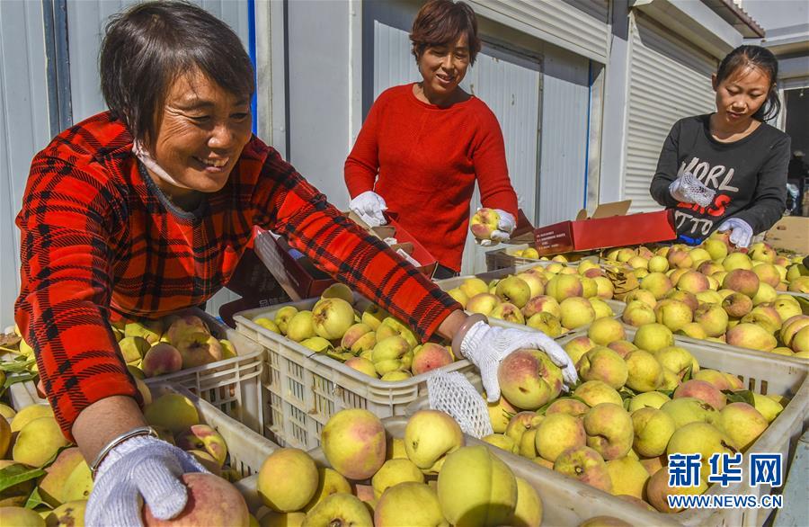10月26日,河北景县润达现代农业园区的工人在分拣冬桃。 近年来,河北景县大力发展错季桃种植。该县的润达现代农业园区种植桃品种达29种,最晚的冬桃10月底成熟,拉长了采摘周期和获利时长。目前,该园区共种植错季桃近300亩,带动150多名村民致富。 新华社记者 李晓果 摄