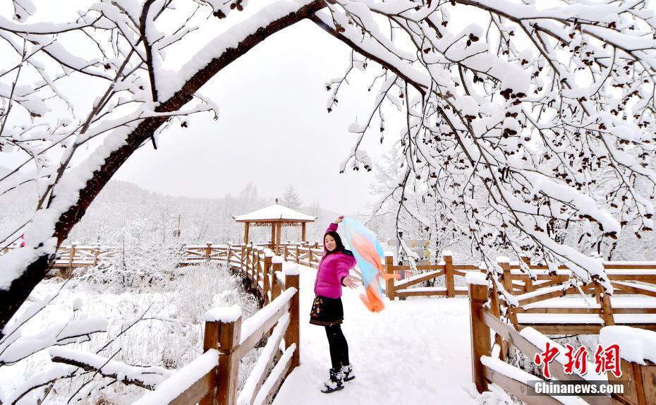 10月26日,游客在雪景中拍照。25日深夜至26日,内蒙古自治区呼伦贝尔境内迎来一场大雪,正值深秋时节,这场大雪的到来将当地森林、草原、湖泊构成一幅幅美丽的“水墨画”,美不胜收。据了解,呼伦贝尔地处内蒙古东北部,作为中国最寒冷的地方之一,其冰雪期长达7个多月。中新社记者 侯玉鹏 摄
