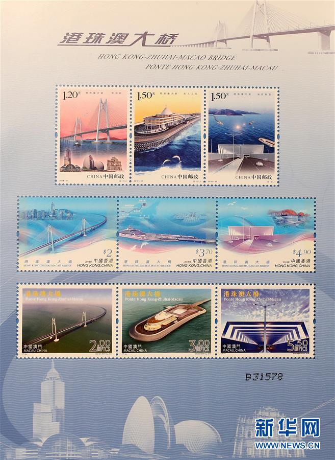 这是10月26日拍摄的“港珠澳大桥”联合纪念套折。 当日,香港邮政宣布,一套以“港珠澳大桥”为主题的特别邮票及相关集邮品将于10月30日发行,中国邮政、香港邮政和澳门邮电还将于30日共同发行一款联合纪念套折。 新华社记者 李钢 摄