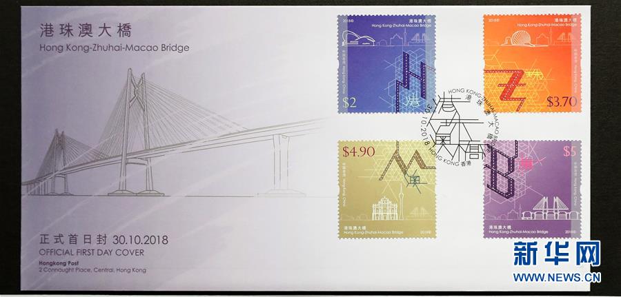 这是10月26日拍摄的贴有“港珠澳大桥”一套四枚邮票的首日封。 当日,香港邮政宣布,一套以“港珠澳大桥”为主题的特别邮票及相关集邮品将于10月30日发行,中国邮政、香港邮政和澳门邮电还将于30日共同发行一款联合纪念套折。 新华社记者 李钢 摄