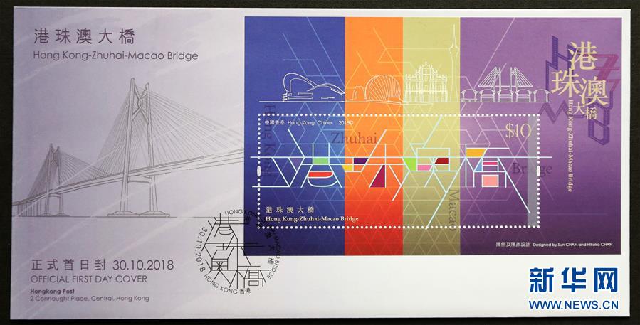 这是10月26日拍摄的贴有“港珠澳大桥”邮票小型张的首日封。 当日,香港邮政宣布,一套以“港珠澳大桥”为主题的特别邮票及相关集邮品将于10月30日发行,中国邮政、香港邮政和澳门邮电还将于30日共同发行一款联合纪念套折。 新华社记者 李钢 摄