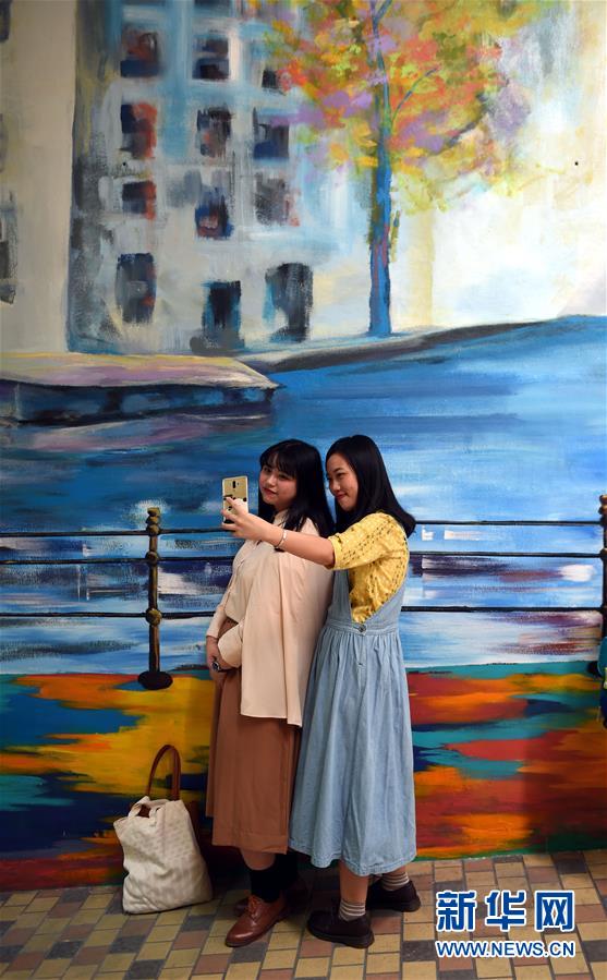 10月26日,市民在香港西营盘奇灵里墙上的壁画前自拍。 日前,9名香港艺术家在西营盘奇灵里的大楼外墙上绘制出一幅幅色彩缤纷的壁画,为整个街道增添不少生气,吸引许多市民游客前来参观。 新华社记者卢炳辉摄