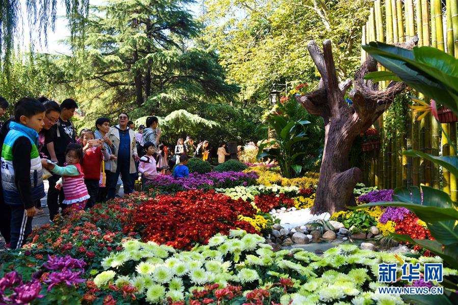 10月28日,游客在济南市趵突泉公园赏菊。