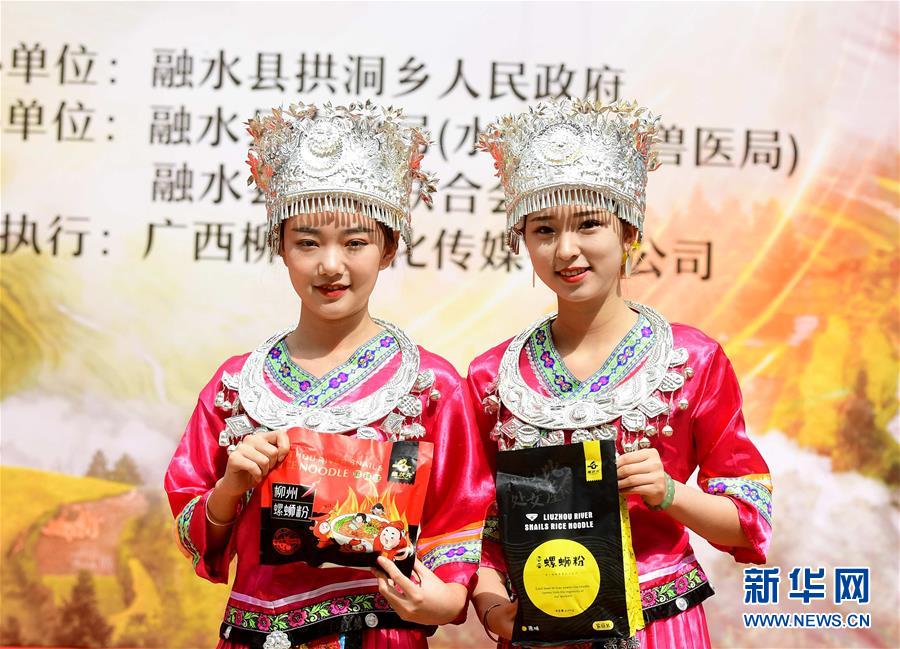 10月28日,在广西融水苗族自治县拱洞乡龙令村,苗家姑娘展示特色产品——螺蛳粉。新华社记者 黄孝邦 摄