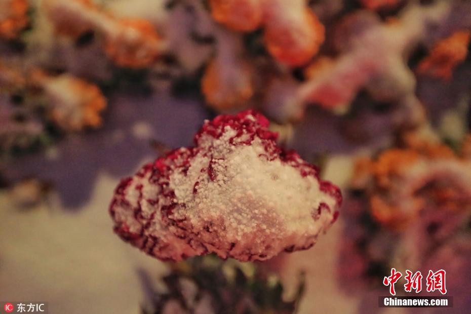 哈尔滨初雪遮掩花树 娇艳犹自开放