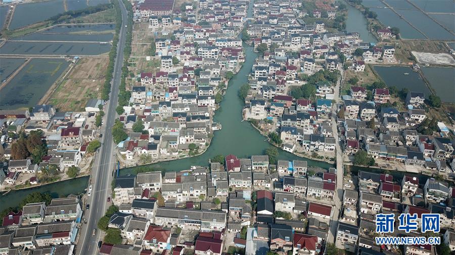 开弦弓村村貌(10月23日无人机拍摄)。小清河穿村而过,从高空俯瞰,南村河道像张弓,北村河道像支箭,村名由此而来。 新华社记者 季春鹏摄