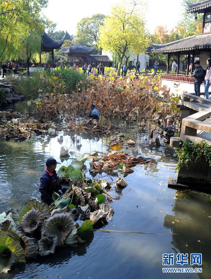 10月29日,工作人员在苏州拙政园内清理残荷。 新华社发(杭兴微 摄)