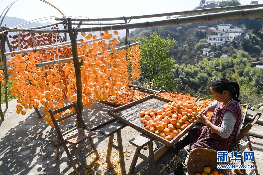 10月29日,安徽歙县姬公尖村村民吴丽花在给柿子刮皮,准备晾晒。新华社记者 张端 摄
