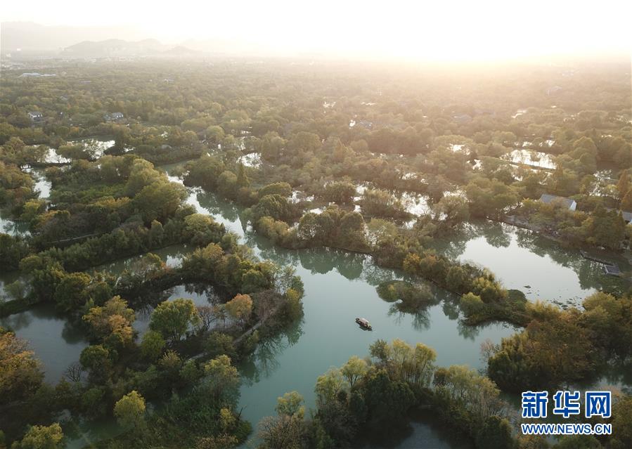 10月29日,游船行驶在西溪湿地河道上(无人机拍摄)。新华社记者翁忻旸摄