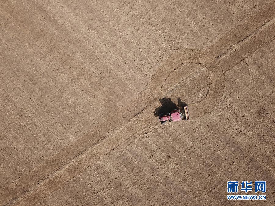 10月29日,江苏省淮安市洪泽区三河镇农户在播种小麦(无人机拍摄)。 当下正值水稻收割、小麦播种的交错时期,各地农民抓紧农时抢收抢种。 新华社发(万震 摄)