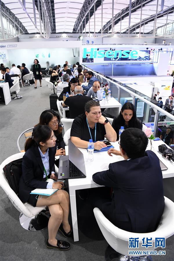 采购商与参展商在第124届广交会上洽谈(10月15日摄)。 新华社记者 梁旭 摄