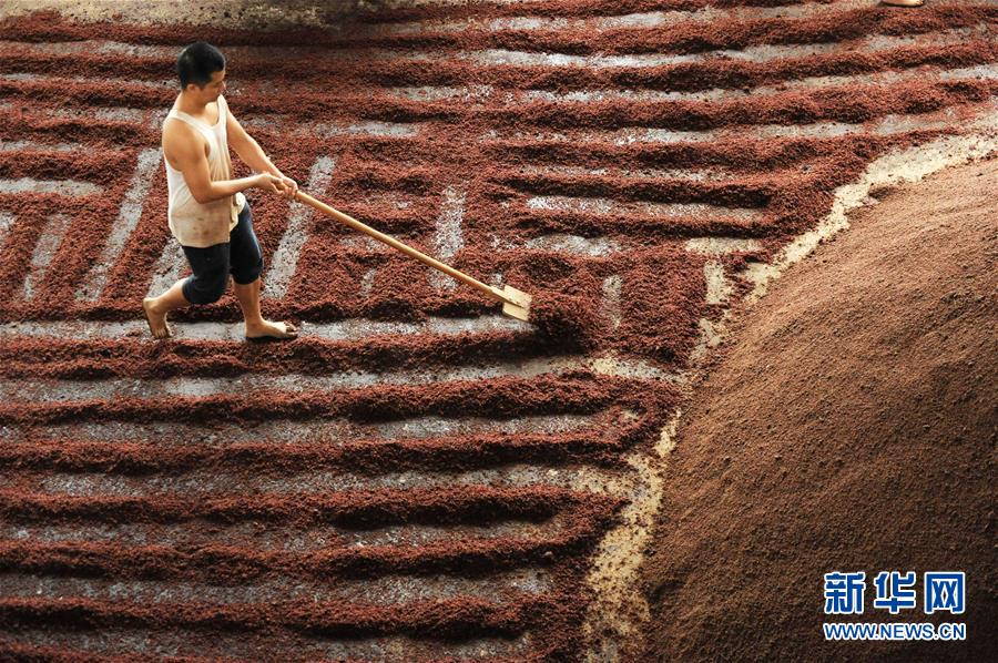 贵州省仁怀市茅台镇一家酒厂的酿酒工人把蒸好的糯高粱进行摊凉(10月23日摄)。 新华社发(杨文斌 摄)