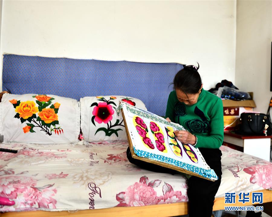 门源县东川镇尕牧龙下村村民陈明梅在“幸福大院”的家里纳鞋垫(10月25日摄)。 新华社发(张龙摄)