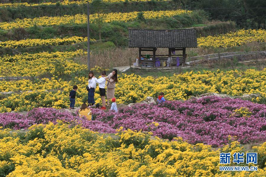 10月30日,游客在湖南省龙山县农车镇一菊园里赏菊拍照。新华社发(曾祥辉 摄)