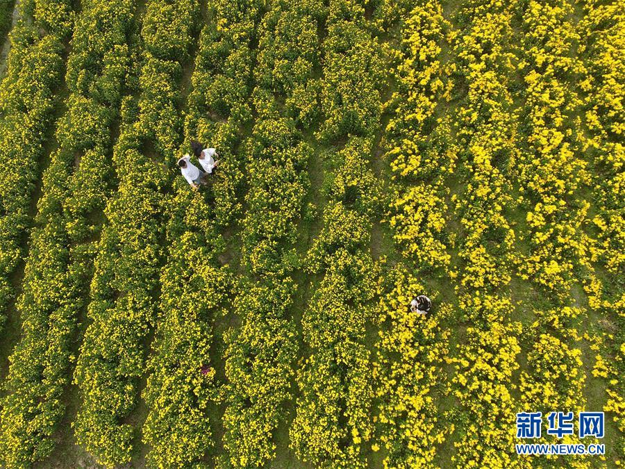 游客在湖南省龙山县农车镇一菊园里赏菊拍照(10月30日无人机拍摄)。新华社发(曾祥辉 摄)