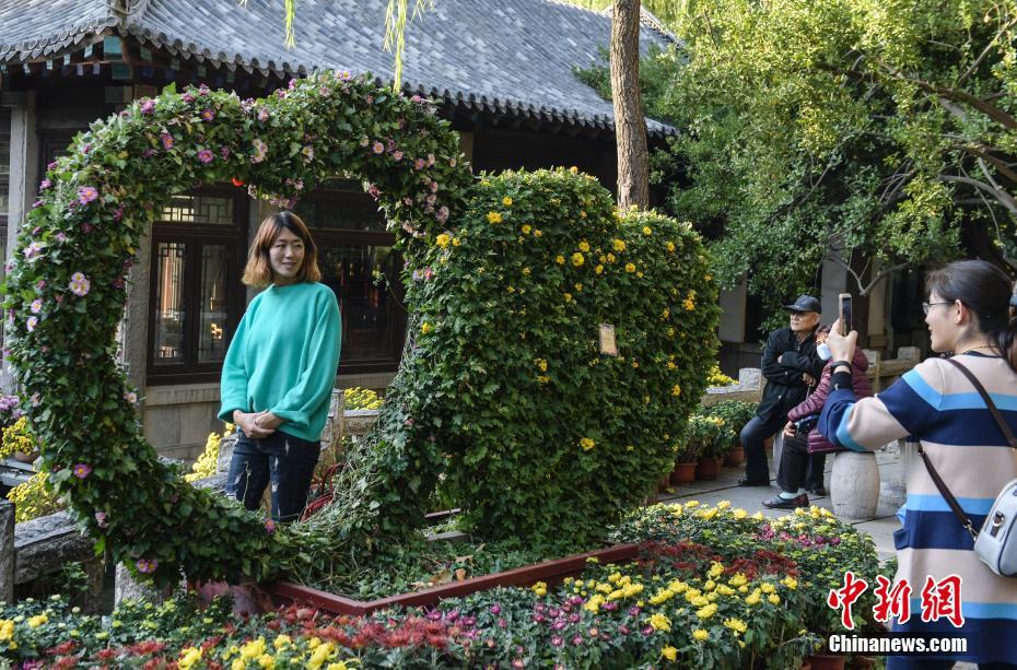 10月30日,在山东济南,游客在“心”形盆景菊前拍照。当日,在济南39届趵突泉金秋菊展上,10万余盆菊花争奇斗艳,吸引许多游客泉畔相菊。中新社记者 张勇 摄