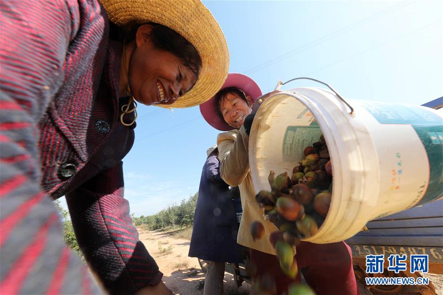 10月30日,在江西省抚州市东乡区瑶圩乡文溪村的千亩生态油茶种植基地,农民在装运收获的油茶果。 新华社发(何江华 摄)