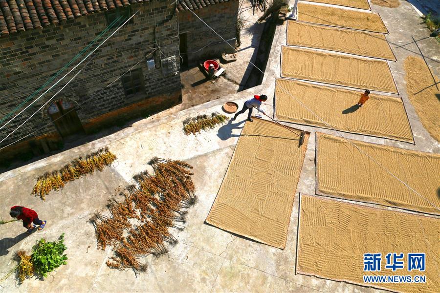 10月30日,江西省乐安县增田镇东湖村村民在晾晒丰收的农作物。 新华社发(曾文才 摄)