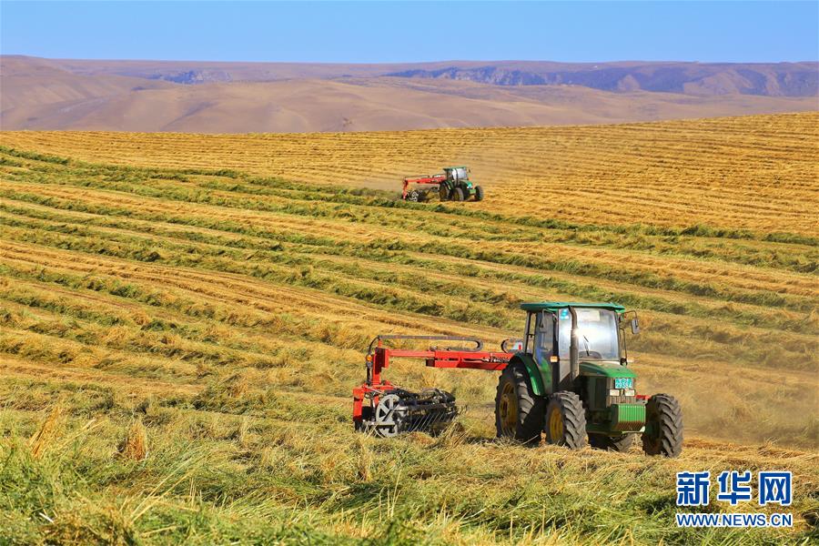 10月29日,甘肃山丹马场农民驾驶机械打捆、拉运燕麦草。 新华社发(王超 摄)
