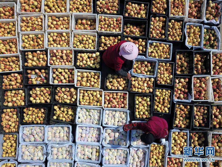 10月30日,江苏省泗洪县天岗湖乡果农在整理收获的冬桃(无人机拍摄)。 新华社发(许昌亮 摄)