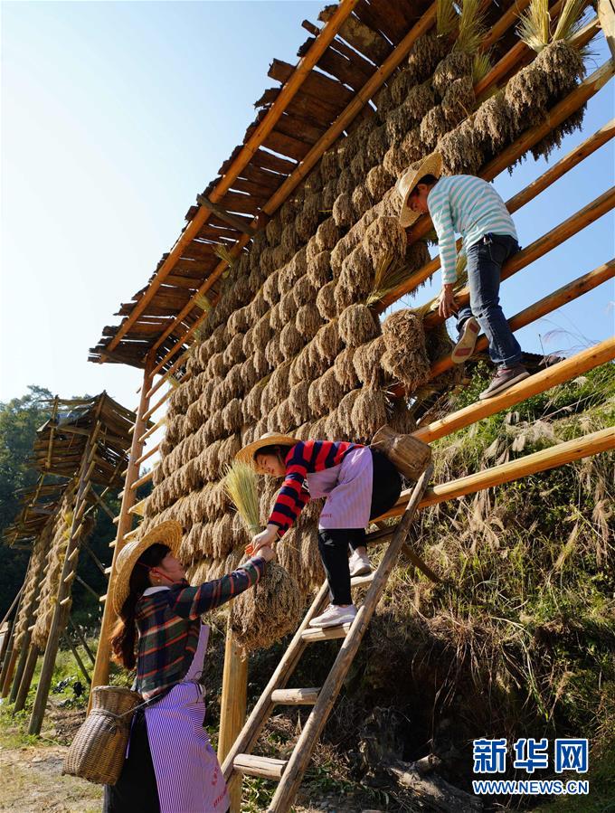 10月29日,在广西龙胜各族自治县乐江乡地灵村村民在晾晒禾把。 新华社发(黄勇丹 摄)