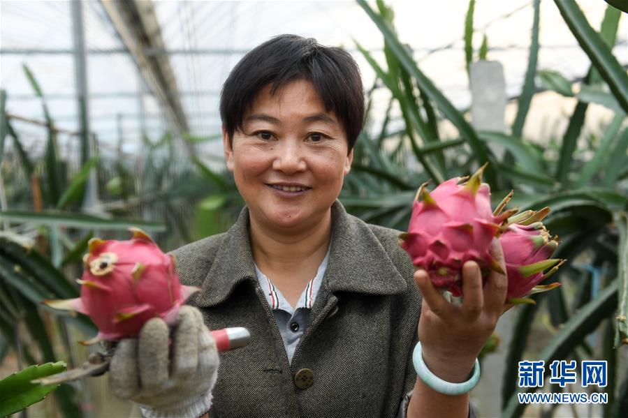 10月30日,李孝菊在大圩镇百果园生态农庄内展示成熟的火龙果。新华社记者 张端 摄