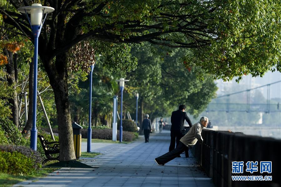 10月30日,市民在黄山市屯溪区新安江畔晨练。金秋时节,晨光中的安徽省黄山市屯溪区新安江薄雾缥缈,风景秀美。 新华社记者 张端 摄