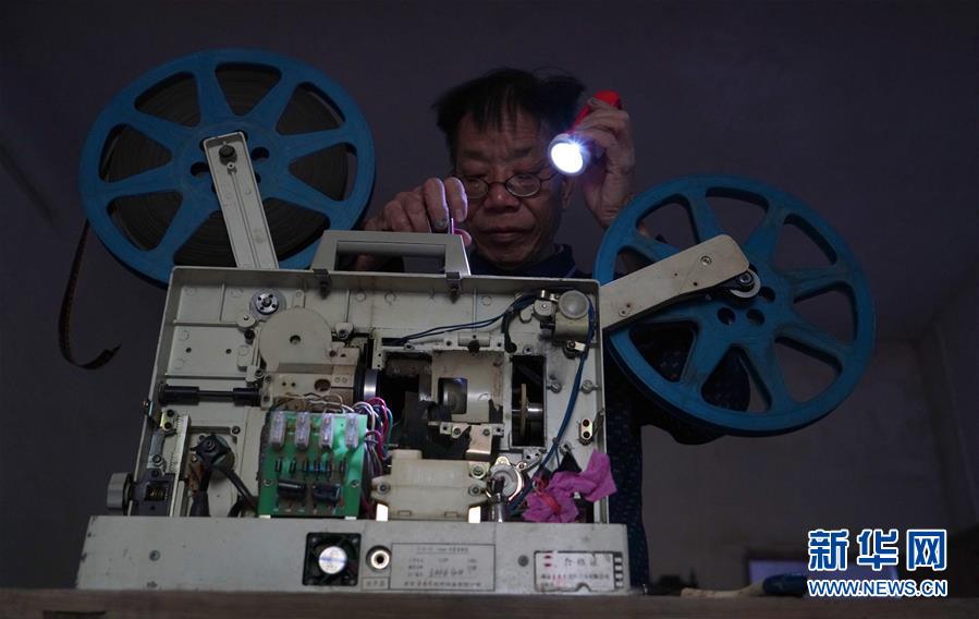 10月30日,曾纪连在家中修理一台老旧的电影放映机。 新华社记者 胡晨欢摄