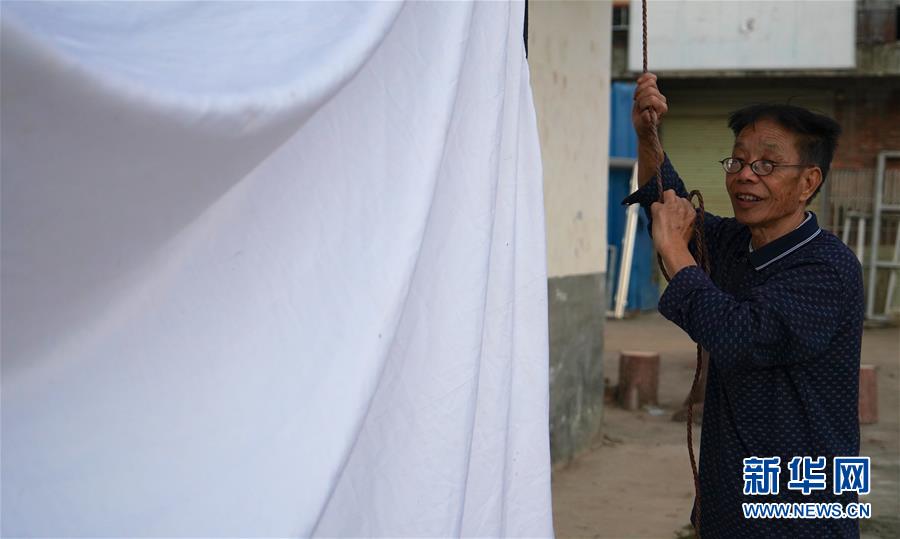 10月30日,曾纪连在宽田乡山下村布置电影放映需要的幕布。 新华社记者 胡晨欢摄