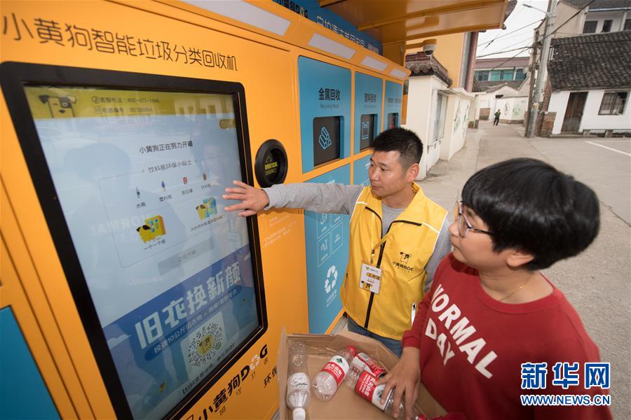 10月30日,在道场乡钱山下村,工作人员(左)指导村民在智能回收机上进行垃圾分类回收。 近年来,浙江省湖州市吴兴区道场乡积极推动农村生活垃圾分类处理,实行村域网格管理,指导村民初分初拣、分类投放,聘请第三方机构实施分类收集、定点投放、清运回收等,形成良性互动的运转体系。目前,全乡有8个行政村实现生活垃圾分类处置全覆盖,有力助推美丽乡村建设。 新华社记者翁忻旸摄