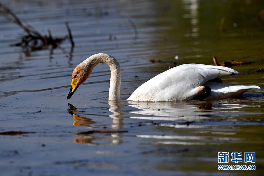 10月31日,大天鹅在山西平陆黄河湿地觅食。新华社记者 杨晨光 摄